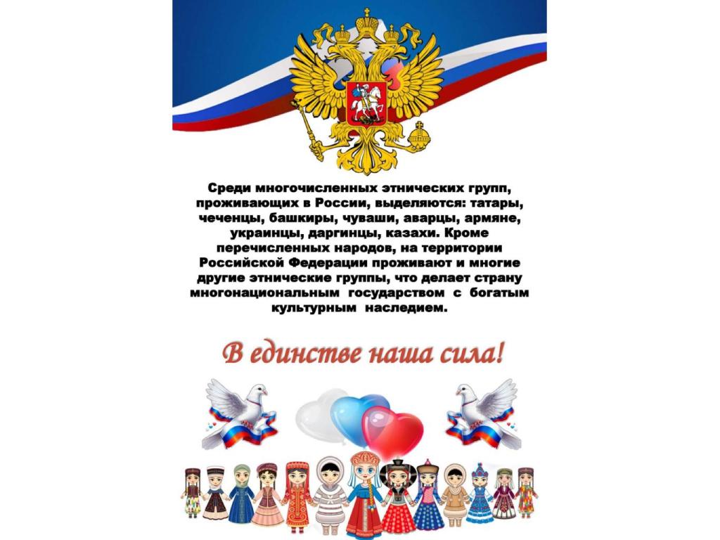 - Наша страна исторически сложилась как многонациональное и поликонфессиональное государство, для которого межэтнические отношения были актуальны во все периоды исторического развития. Главная задача национальной политики на современном этапе – обеспечение гражданского единства в условиях многообразия страны и этнокультурного развития общностей и регионов. По данным Росстата (на начало 2024 года) численность населения Российской Федерации составляет 146,5 млн. человек. Национальный состав населения России характеризуется следующим соотношением: русские составляют около 80% от общего числа жителей страны; представители других национальностей — примерно 20% населения. Среди многочисленных этнических групп, проживающих в России, выделяются: татары, чеченцы, башкиры, чуваши, аварцы, армяне, украинцы, даргинцы, казахи. Кроме перечисленных народов, на территории Российской Федерации проживают и многие другие этнические группы, что делает страну многонациональным государством с богатым культурным наследием. В работе библиотек надо руководствоваться законодательством РФ. В частности, Указом Президента Российской Федерации от 11.07.2025 № 474 «Об утверждении основ государственной языковой политики Российской Федерации».
