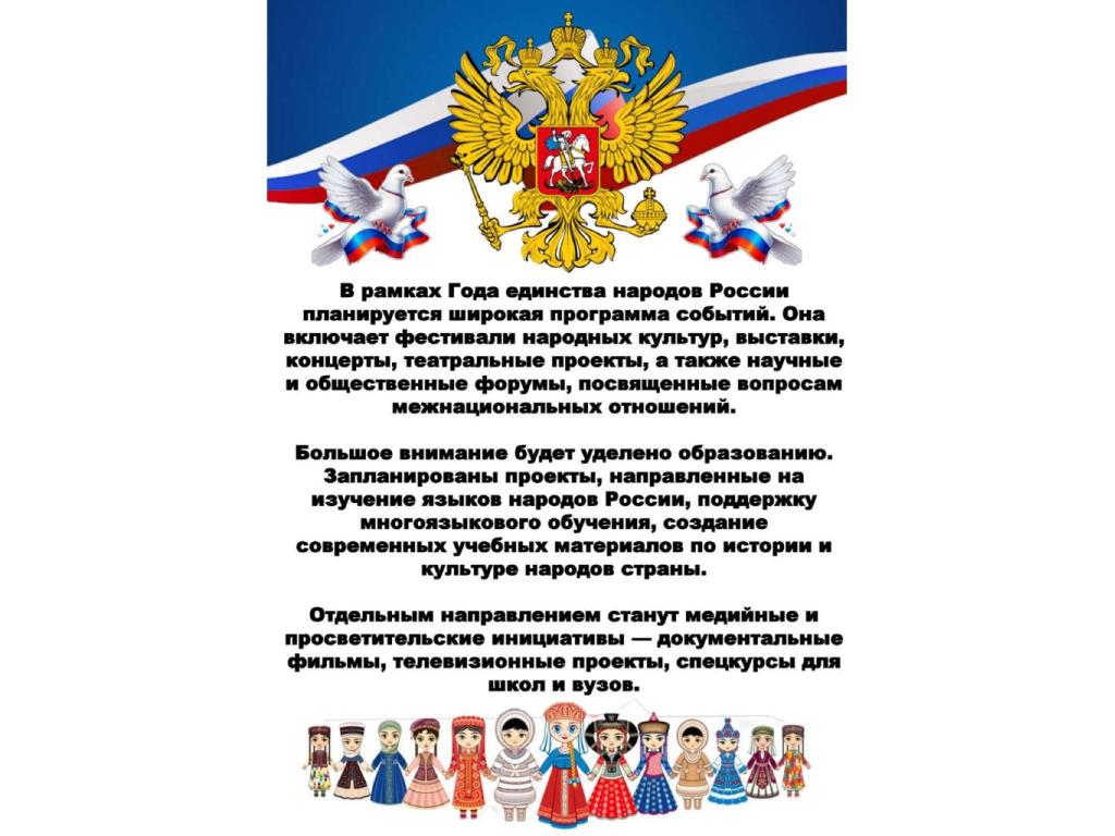 Объявление 2026 года Годом единства народов России направлено на достижение национального единства, мира и согласия между всеми народами страны.