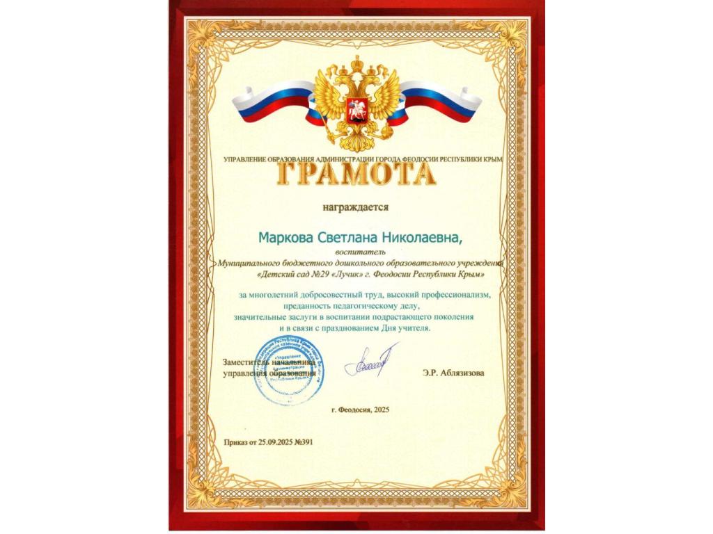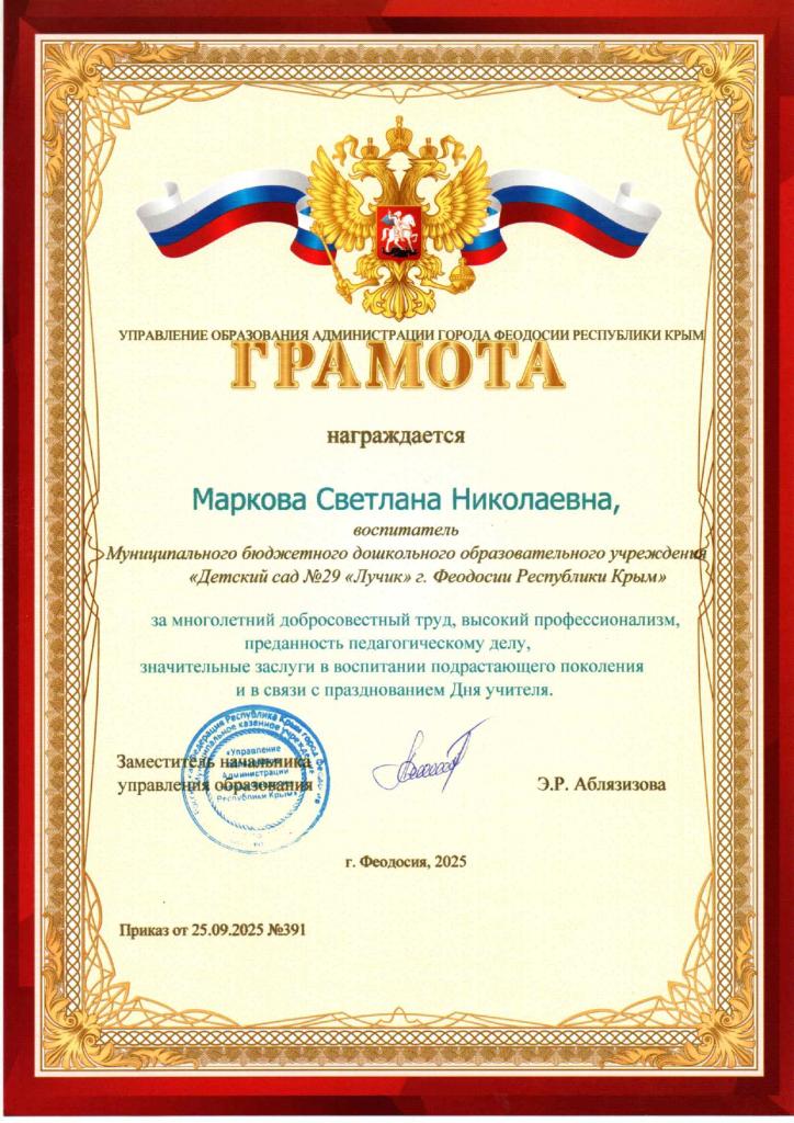 Средне-специальное, воспитатель дошкольного учреждения (Запорожское педагогическое училище, дата окончания 1992г.), педагогический стаж работы 33 лет.
