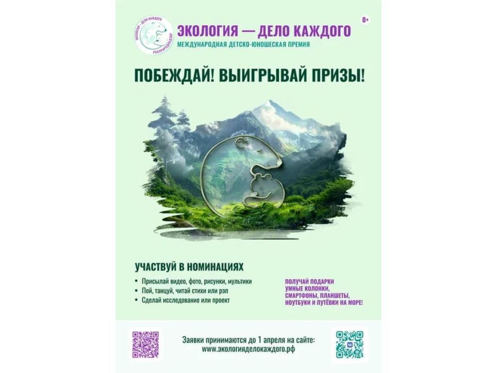 «Экология – дело каждого» – это премия Росприроднадзора за интересные, нестандартные, креативные идеи, инициативы, выдающиеся проекты, посвященные сохранению окружающей среды, бережному отношению к природе, экологическому просвещению и популяризации экокультуры.